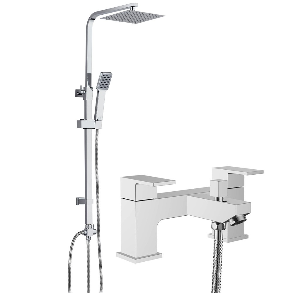 Boston Chrome Deck Mounted Bath Shower Mixer Tap & Square 3 Way Telescopic Rigid Riser Shower Rail Kit