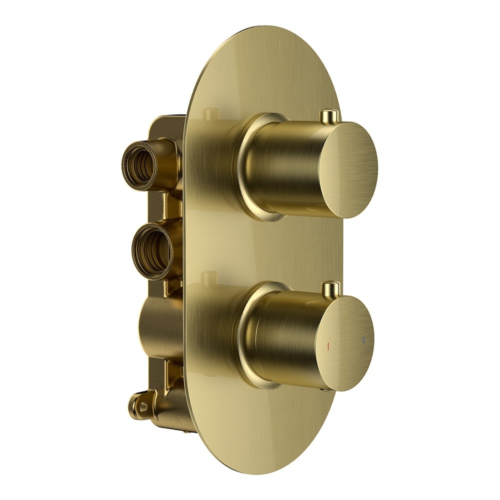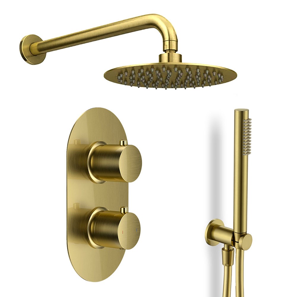 Dual Control Brushed Brass Round Concealed Thermostatic Shower Mixer Valve with Handset & Wall Mounted Shower Head - 2 Outlet Diverter