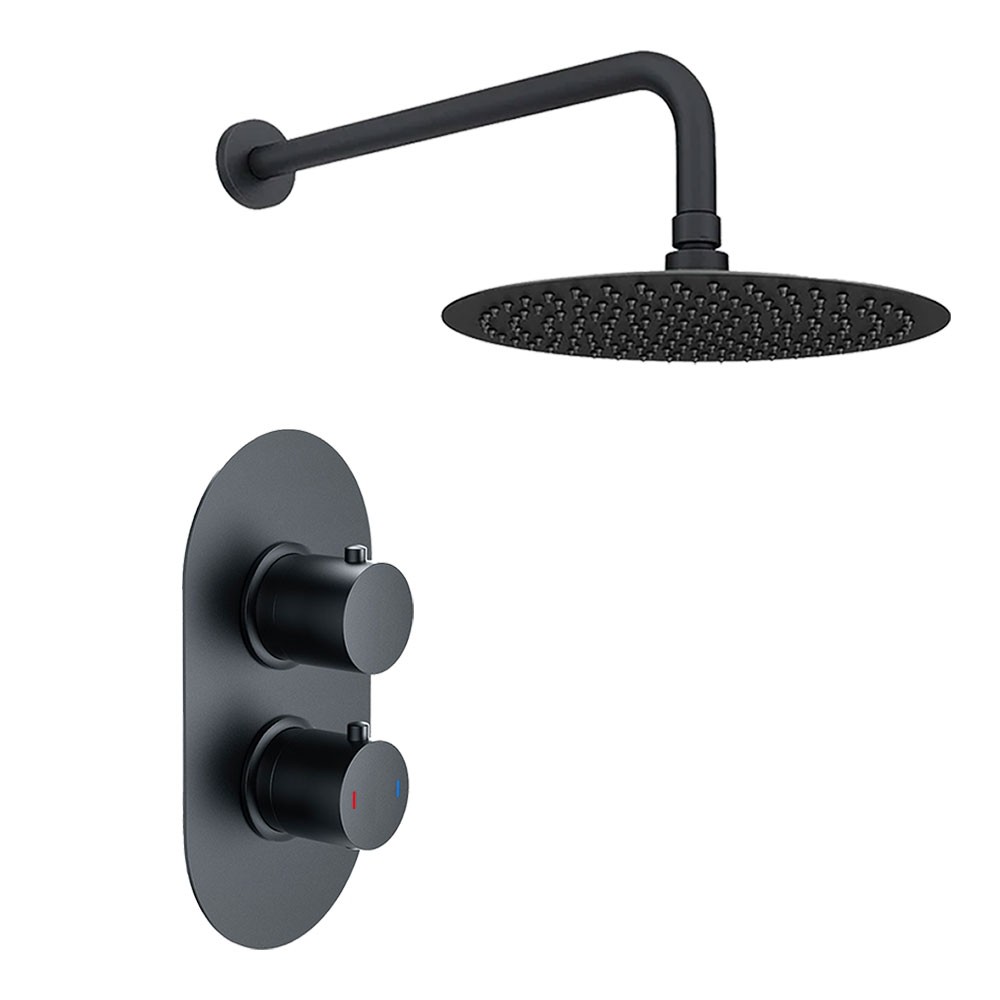 Dual Control Matt Black Round Concealed Thermostatic Shower Mixer Valve with Wall Mounted Shower Head - 1 Outlet