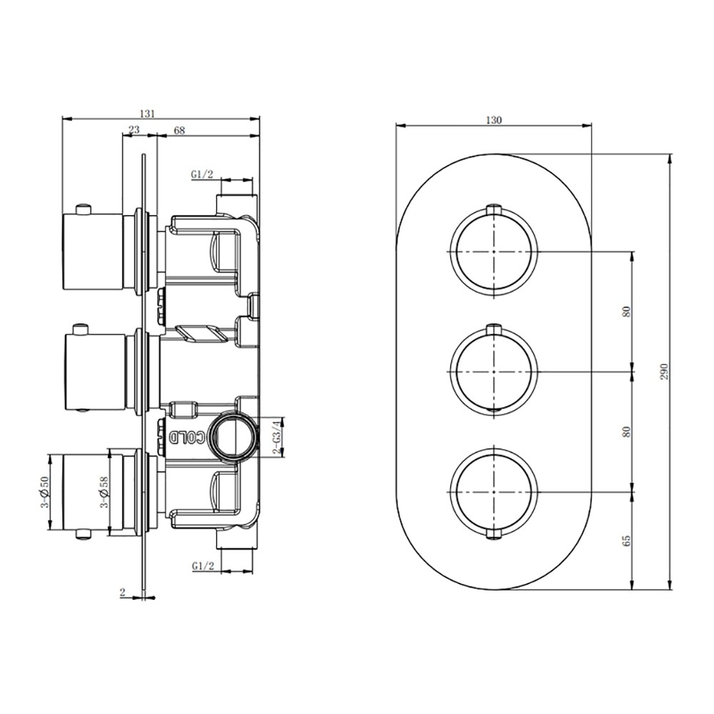 Triple Control Gunmetal Grey Round Concealed Thermostatic Shower Mixer Valve with Slider Rail Kit & Wall Mounted Shower Head - 2 Outlet Diverter